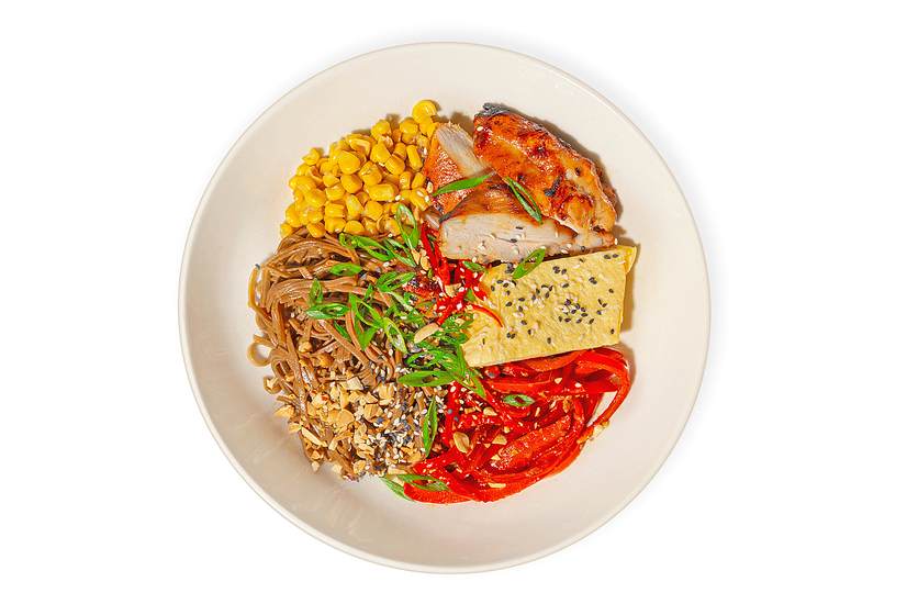 Локшина гречана з соусом, куряче стегно (кисло-солодке), кукурудза консервована, перець болгарський гриль, соус теріяки, омлет азія, цибуля зелена очищена, кунжут мікс, арахіс смажений, перець чилі очищений.